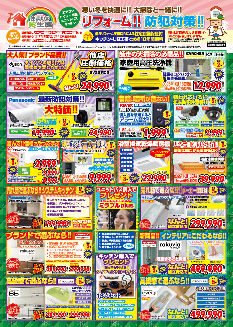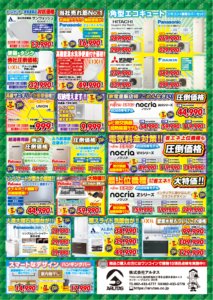 2025年11月~12月チラシ情報 2025.11.01(Sat) ブログ 急激に冷え込む時期になりましたね🥶 今年もあと2か月🗓️ 大掃除を早めに初めてゆっくり年末を迎えたいですね 11月、12月は人気のお掃除アイテムを数量限定でご用意できます✨ もちろん水回りリフォーム設備も充実👍 詳しくは下のチラシを要チェック✅ お見積り無料ですのでお気軽にご相談ください! お問合せ心よりお待ちしております。 📞 お問い合わせ先:[092-433-6777] 詳細はチラシをクリック☟☟
